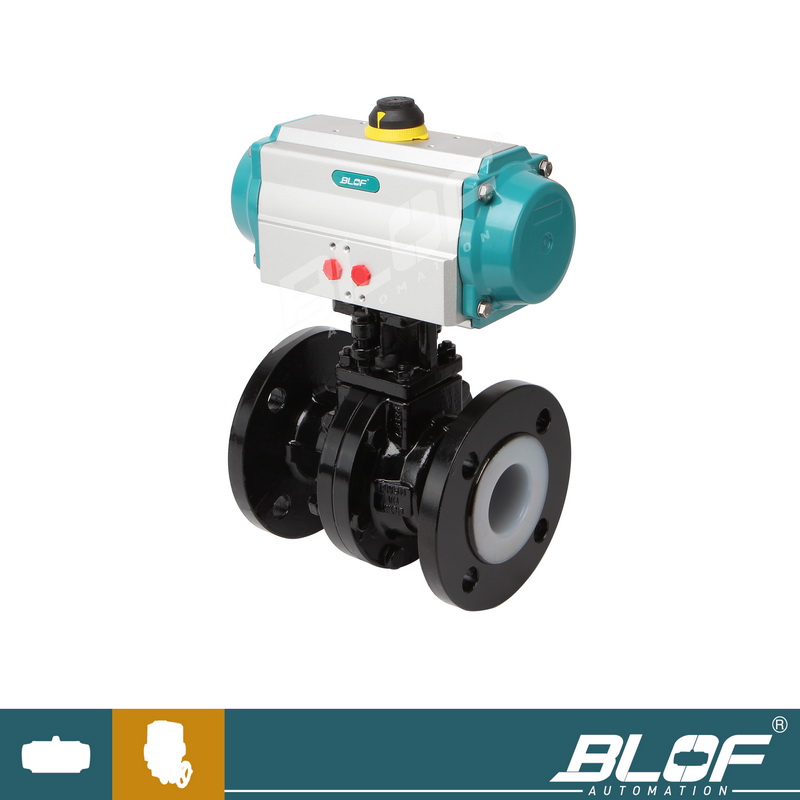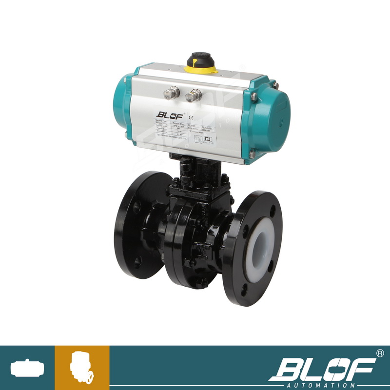 公称通径DN(mm) 15~300 公称压力(MPa) PN1.0、1.6 MPa 阀体形式 两段式阀体(浮动球体、固定球体) 连接形式 法兰式 阀芯形式 "O"型球形阀芯 密封填料 聚四氟乙烯(PTFE) 流量特性 近似快开型 动作范围 0~90° 泄露量Q 软密封:零泄漏 适用温度 PTFE≤180℃ 基本误差 带定位器:小于全行程的±2% 死区 带定位器:小于全行程的2% 可调范围 250:1 配置执行机构 BLR BLP系列单双作用气动执行器 控制方式 开关两位控制、4-20mA模拟量控制 气动衬氟球阀 执行器参数